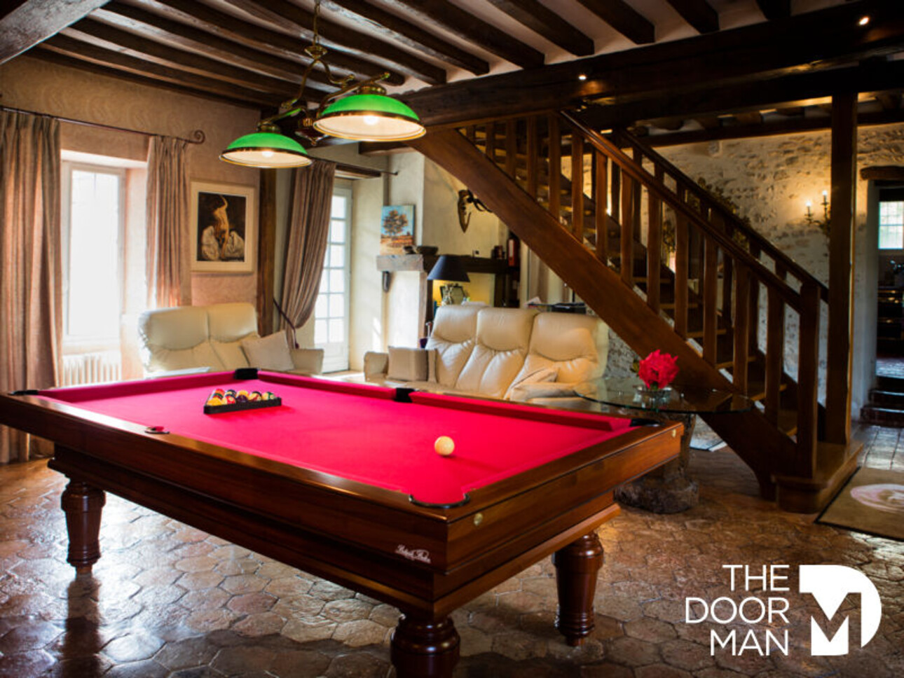 - Hall d'entrée et sa salle de billard de 48.5m² avec cheminée ancienne,