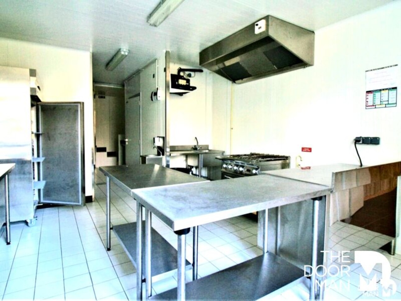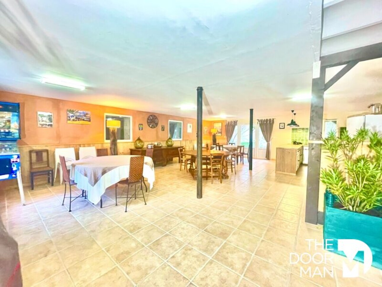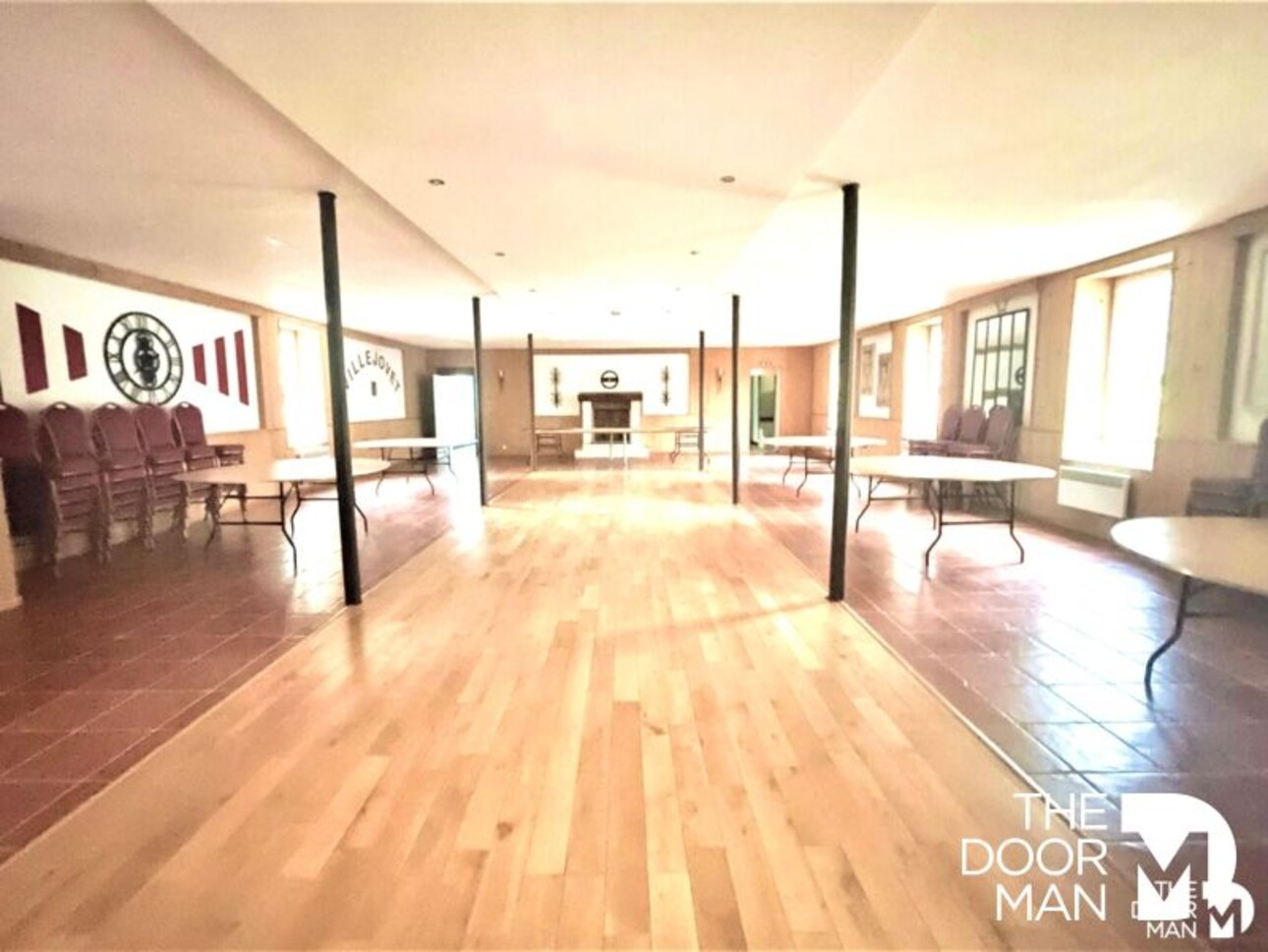 - Une salle de réception pouvant accueillir 100 personnes (les tables et chaises resteront sur place). Elle se compose d'une entrée avec placard, dressing pour les manteaux et toilettes aux normes handicapées. À la suite, une cuisine professionnelle entièrement équipée et conforme aux normes (25 000 €) ainsi que différents dégagements.